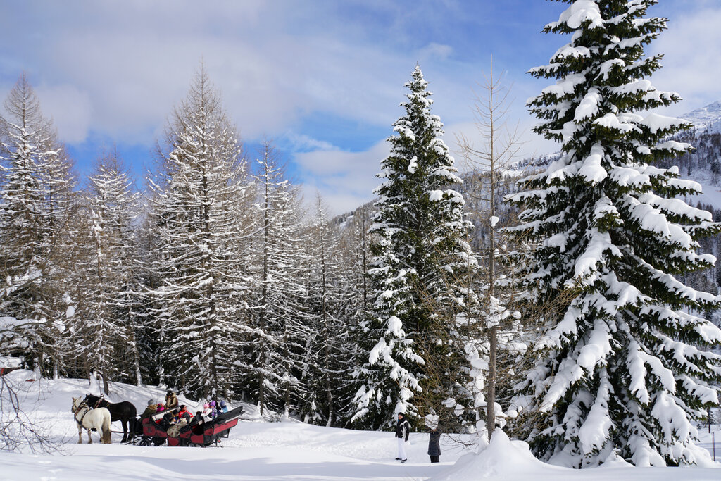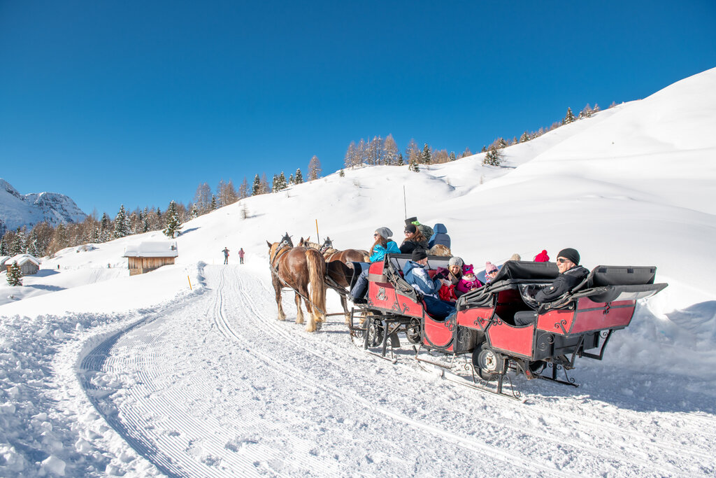 Lassen Sie sich vom Klang der Glocken verzaubern, begleitet vom Rauschen des Schnees unter den Schlittschuhen, dem Klopfen der Hufe auf dem Boden und dem märchenhaften Panorama des Fuciade-Beckens, das von den südlichen Gipfeln der Marmolada-Gruppe umarmt wird.