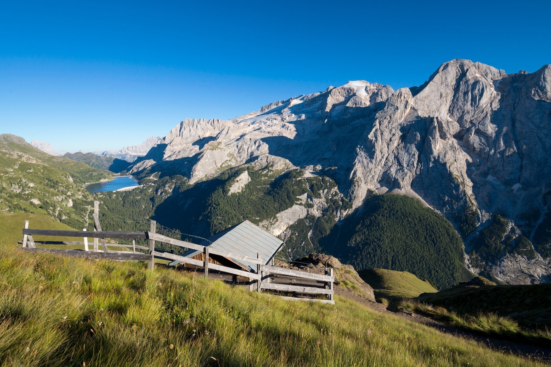 Ai piedi della Marmolada (3343 m), il Passo Fedaia segna il confine tra Trentino e Veneto. La località, che prende il nome dal ladino “feida” (pecora) perché anticamente era zona di pascolo, è caratterizzata dalla presenza del Lago. Il Fedaia, d’estate, è punto di partenza per numerose escursioni, mentre da febbraio a maggio è mecca di alpinismo e freeride sul versante Nord della Marmolada, dove durante la prima guerra mondiale i militari costruirono la città di ghiaccio, di cui oggi non resta traccia.