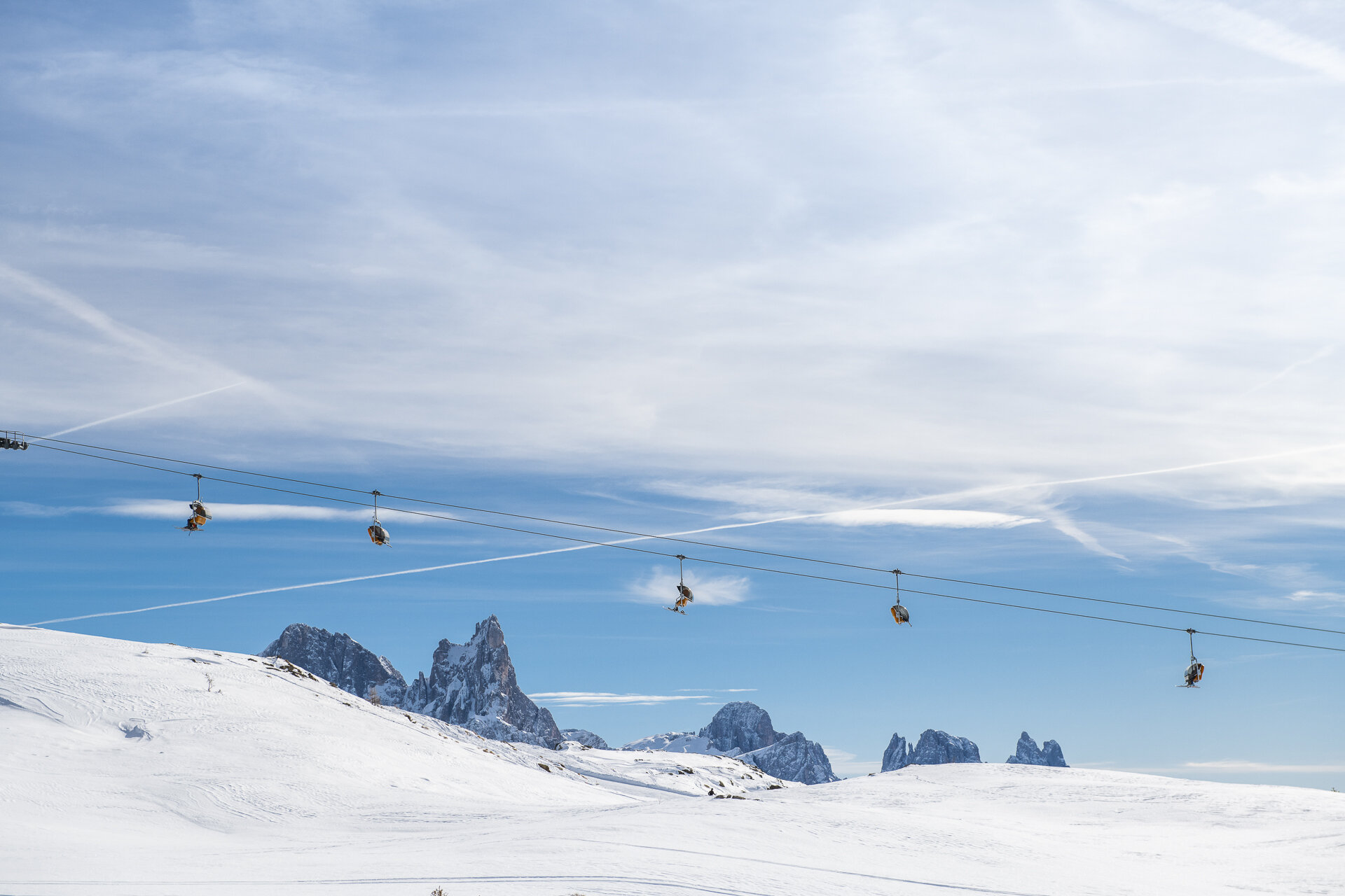 Vista dall’arrivo della cabinovia Molino-Le Buse, inaugurata nel 2015, verso il Monte Mulaz, le Cime di Focobon e le Pale di San Lucano (gruppo Pale di San Martino).