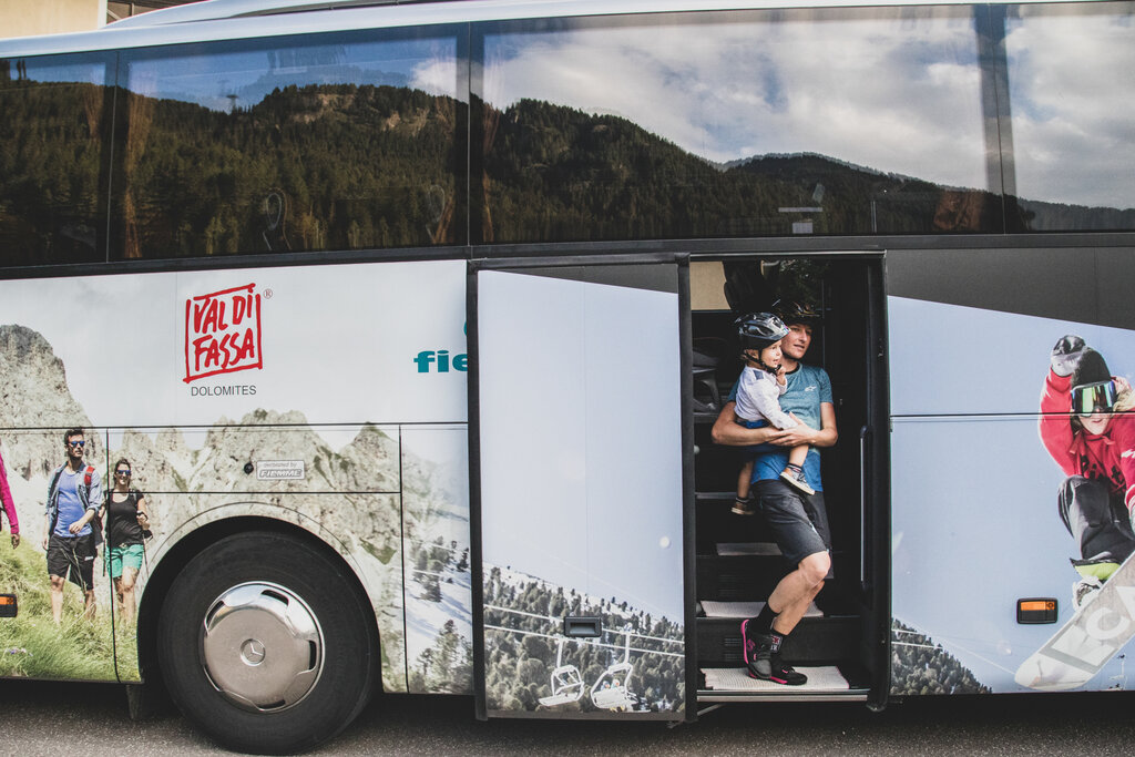 Il servizio bus riporta in Val di Fassa i ciclisti che scendono da Alba di Canazei a Molina di Fiemme lungo la pista ciclabile.